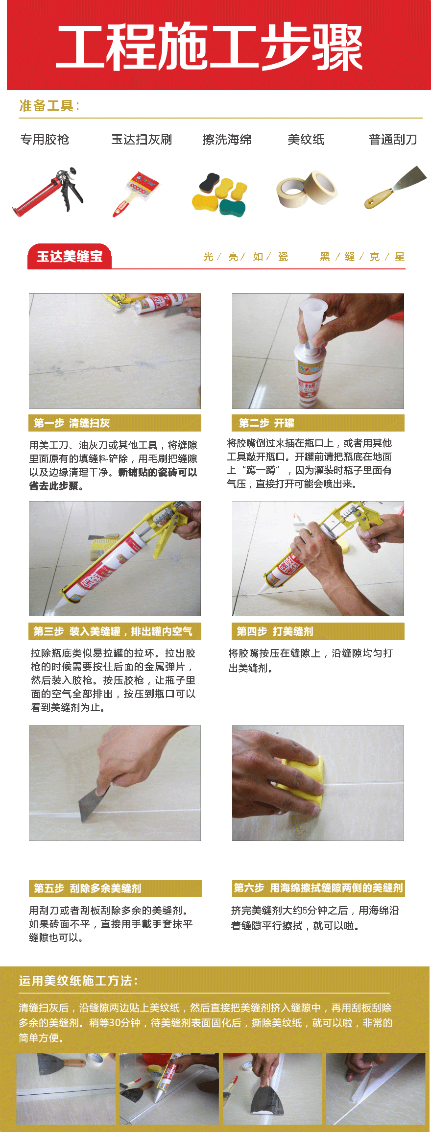 本產(chǎn)品覆蓋在瓷磚縫隙表面會形成光滑如瓷的潔凈面,