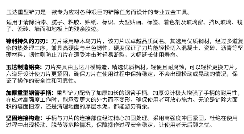 重型鏟刀配備了加厚加長(zhǎng)的鋼管手柄。加厚設(shè)計(jì)極大增強(qiáng)了手柄的耐用性,