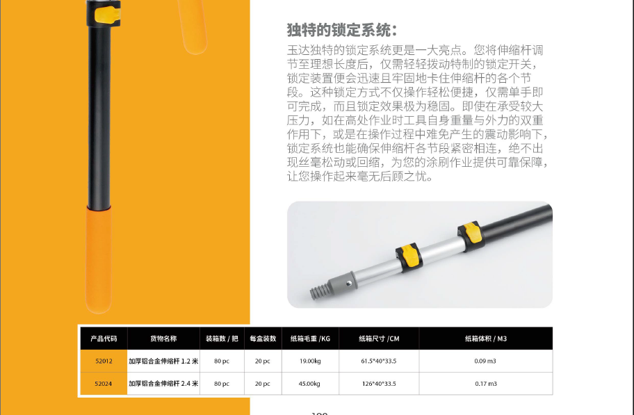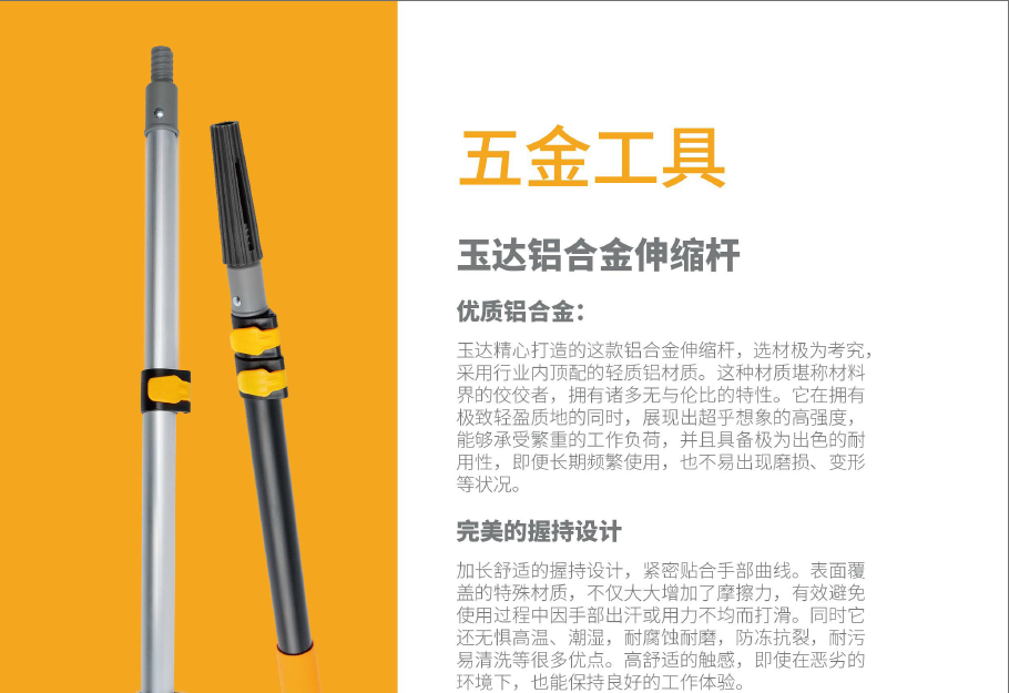 玉達精心打造的這款鋁合金伸縮桿,選材極為考究,采用行業(yè)內頂配的輕質鋁材質。