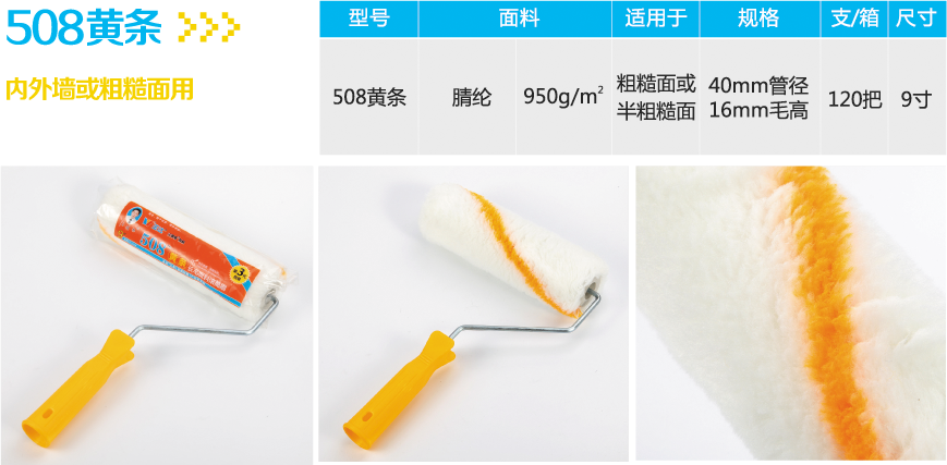 滾筒刷又稱輥筒刷,搭配漆盤使用更好,由于涂面大,所以是最省力、省時的涂刷工具。在接上延長桿后,可輕易粉刷墻面高處或天花板。滾筒刷制造在中國已有30年的歷史,其質(zhì)量表現(xiàn)的關(guān)鍵部分由滾絨布和滾筒“管+芯+卡”技術(shù)質(zhì)量決定,其中滾筒管芯性能的好壞可以直接影響使用感覺和使用壽命。市場上普遍銷售的滾筒使用劣質(zhì)不吸漆的低彈絳綸絨布,且管芯靠“單管塞單卡”支撐滾刷支架,在滾涂過程中會表現(xiàn)出來滑芯、卡裂、管裂、支撐滾頭不穩(wěn)定、跳動、著面不平、不耐溶劑等缺陷,造成涂刷不均勻,耗時耗力,且刷面不美觀,影響使用效果。
