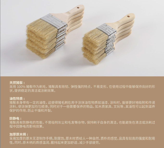豬鬃具有防靜電的性能,不易吸附灰塵和毛發(fā)等雜物,保持刷子自身的清潔,也能避免在清潔或涂刷過
